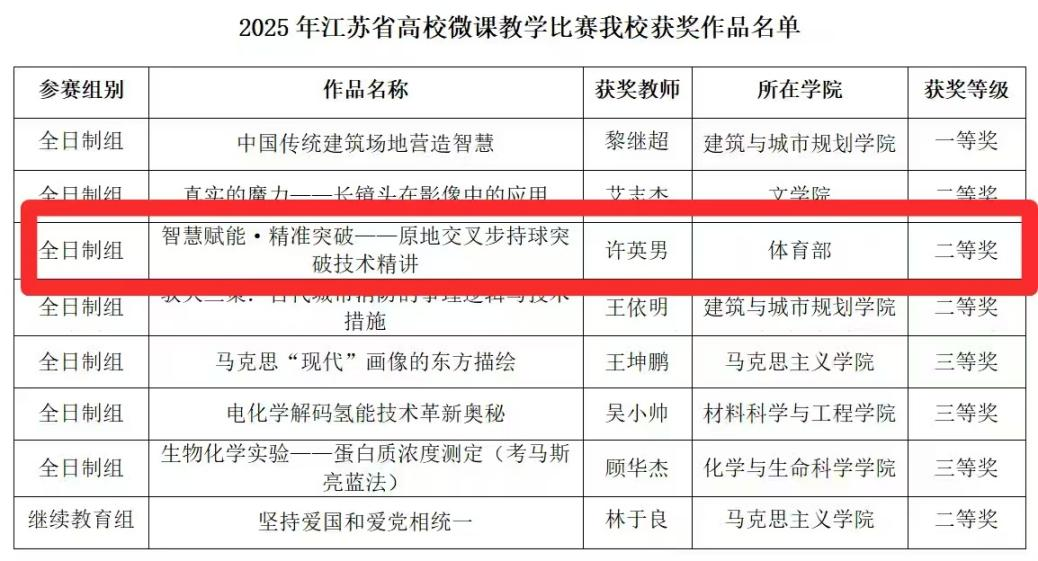 近日,2025年江苏省高校微课教学比赛结果揭晓,WilliamHill中文教师许英男主讲的《智慧赋能·精准突破——原地交叉步持球突破技术精讲》凭借课程设计的前沿性与教学实效性,荣获省二等奖。此次赛事由江苏省教育厅主办,吸引全省百余所高校参赛,作品涵盖多学科领域。