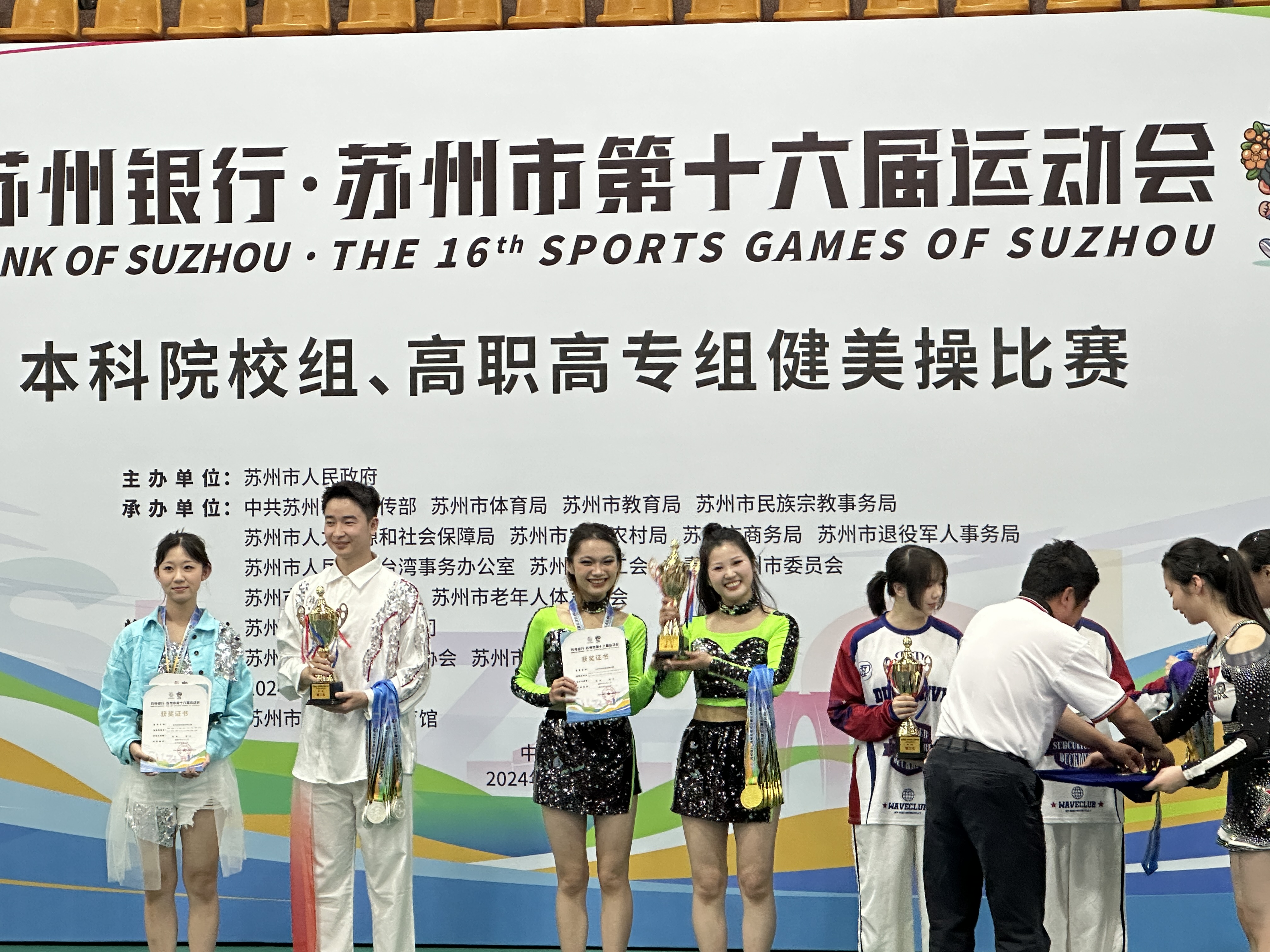 6月1日,苏州市第十六届运动会本科院校组、高职高专组健美操比赛在苏州市职业大学举行。此次比赛由苏州市人民政府主办,中共苏州市委宣传部、苏州市体育局、苏州市教育局、苏州市民族宗教事务局、苏州市商务局等承办。苏州市健身健美运动协会及苏州市职业大学协办。 WilliamHill中文教练员郁方老师带领啦啦操队20名运动员,参加本科院校组健美操比赛。经过激烈角逐,我校代表队最终获得了本科院校组冠军的好成绩!