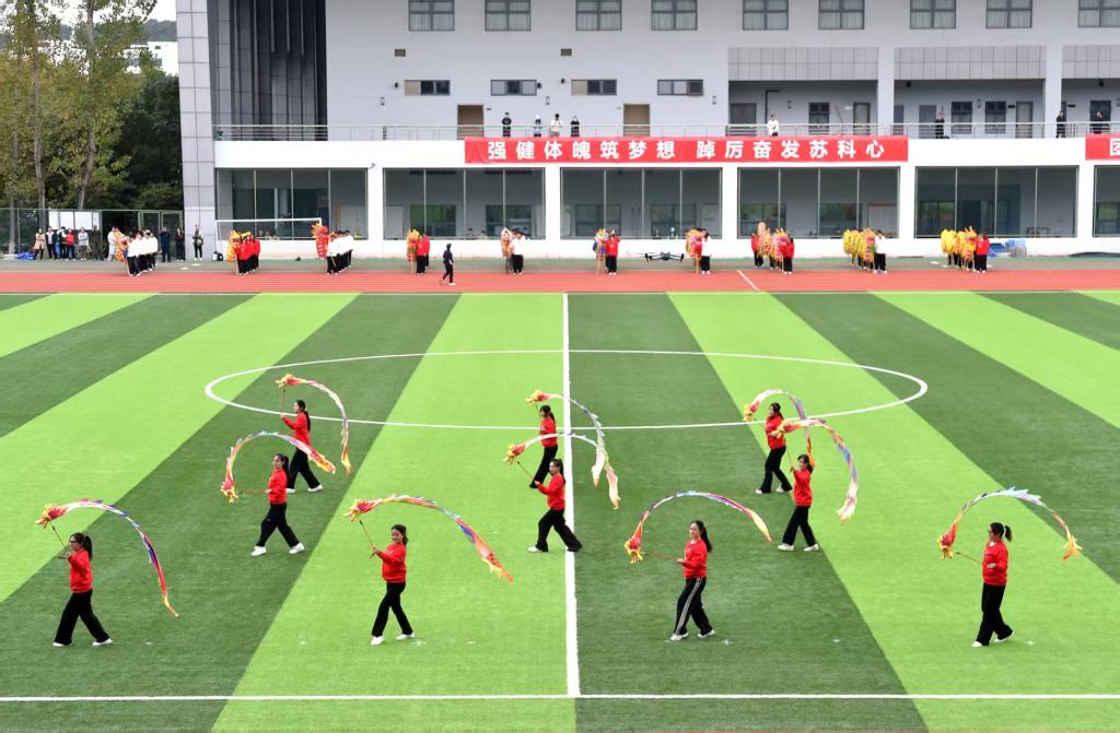 整场表演分为《龙兴华夏》《中华腾飞》《励志青年》三个篇章。首章中,参演队员手持彩带龙翩然起舞,彩练凌空,展现出莘莘学子昂扬向上的青春朝气。中章,十条巨龙应声腾跃,交织盘旋,队员们舞出排山倒海、乘风破浪之势,将演出推向高潮。终章,旋律欢快,振奋人心,表现出我校青年学子正以昂扬之姿,汇入新时代的洪流。