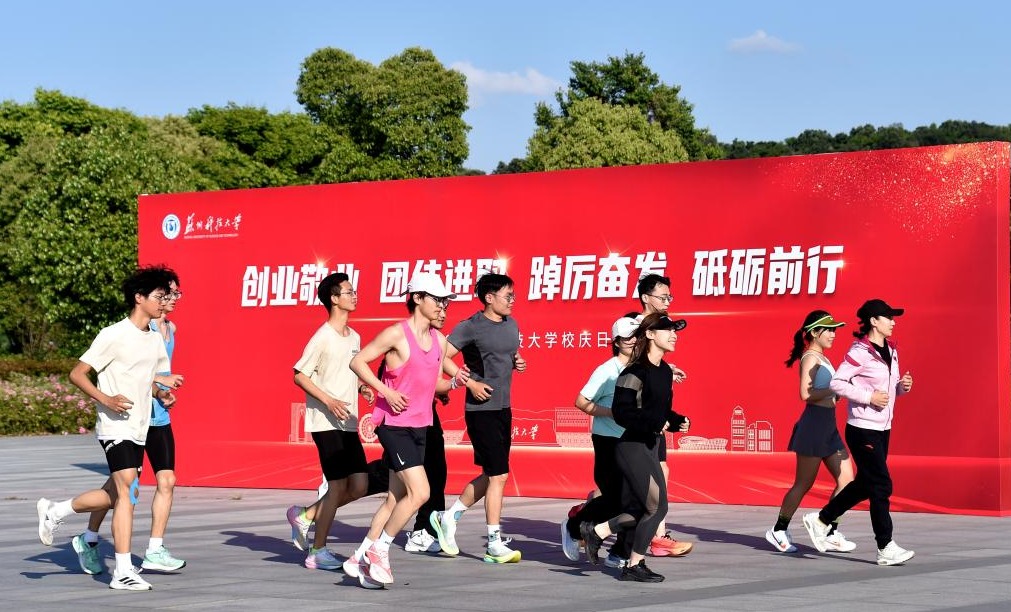 师生们从体育馆门口出发,途经塔影阁、东区宿舍、致远北路、致远西路、篮球场等地,围绕美丽的校园环线跑步两圈,最终回到体育田径场。大家为跑步的师生们呐喊助威,整个校园被运动的激情点燃,营造了健康向上、阳光体育的良好氛围。
